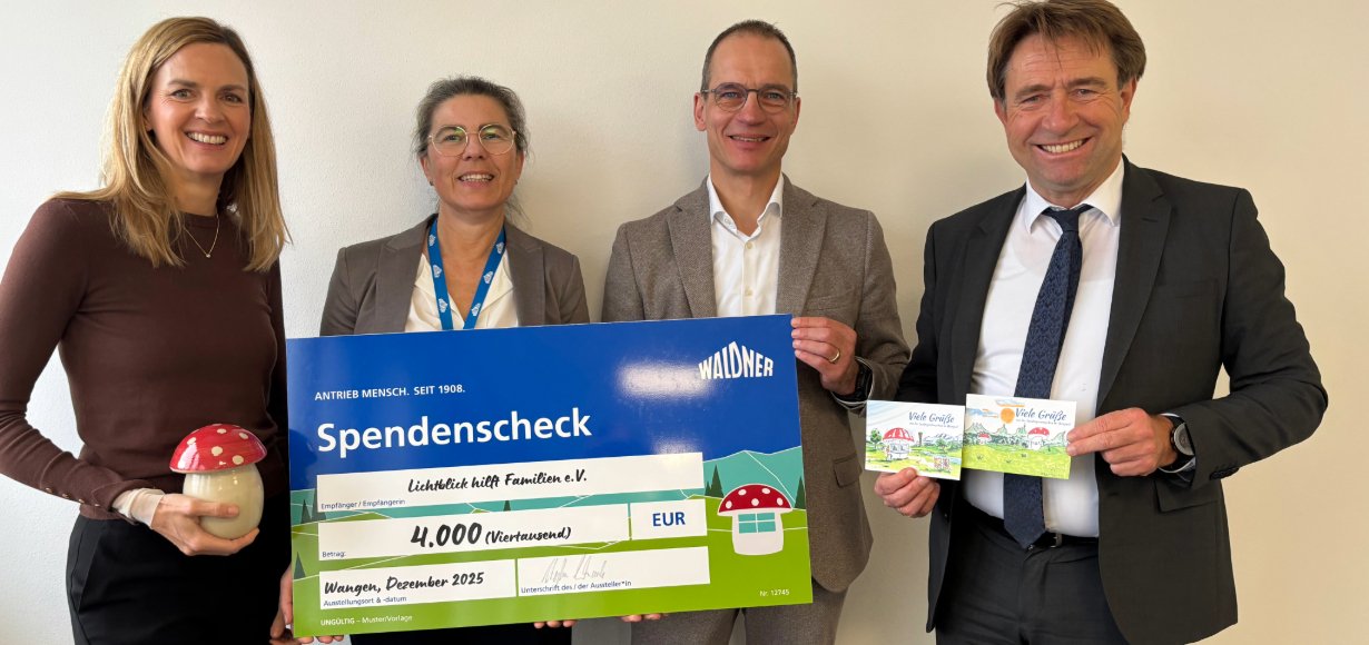 Marion Lang and Alexandra Jacobi (Lichtblick Association, from left) and Mayor Michael Lang (right) are delighted with the donation presented by Stephan Schaale (CFO of the Waldner Group, centre) on behalf of Waldner to the association ‘Lichtblick hilft Familien e.V.’.